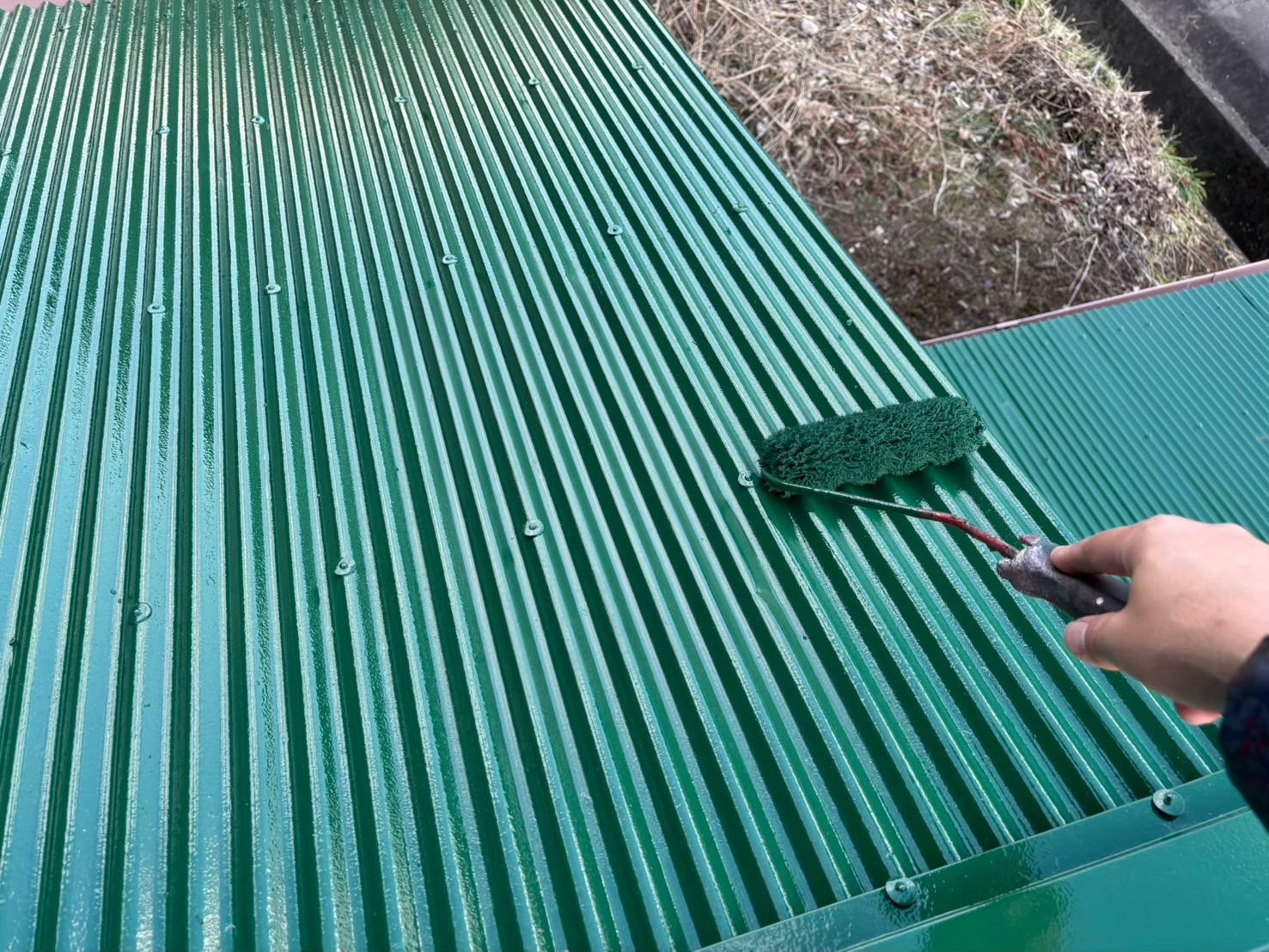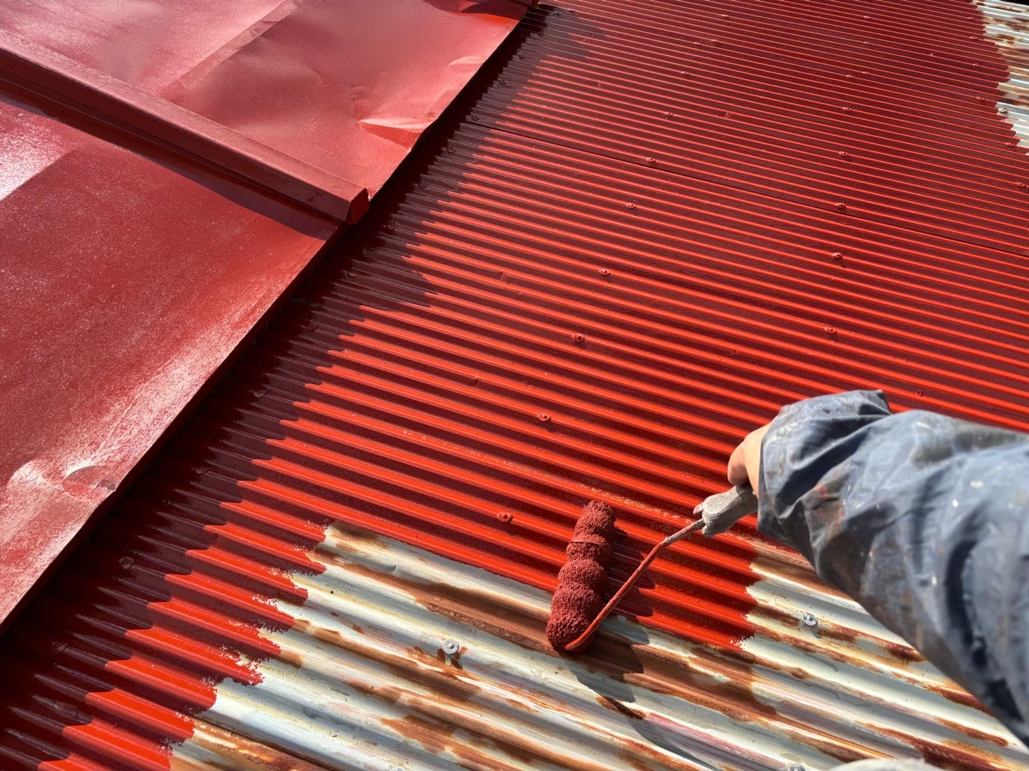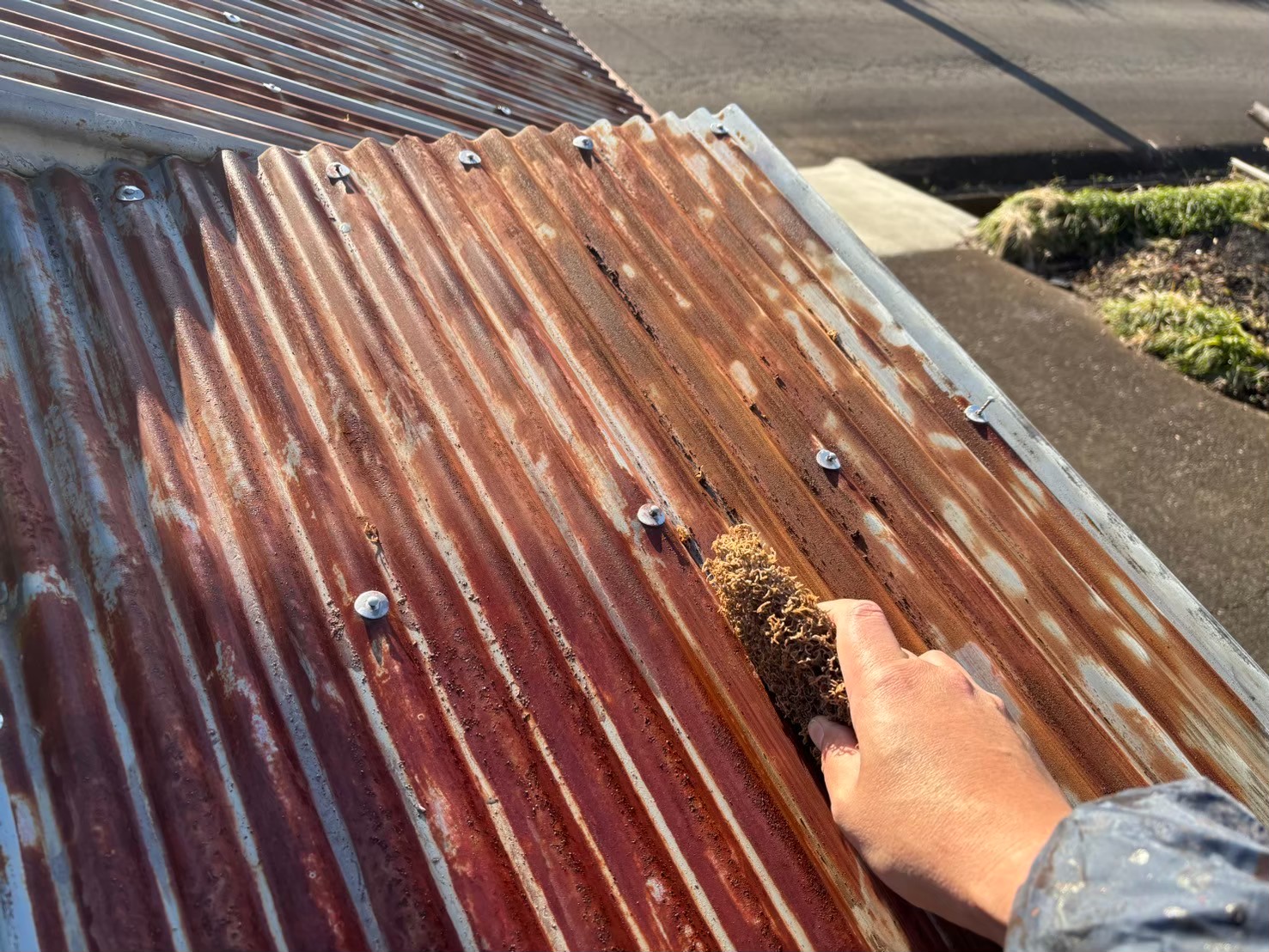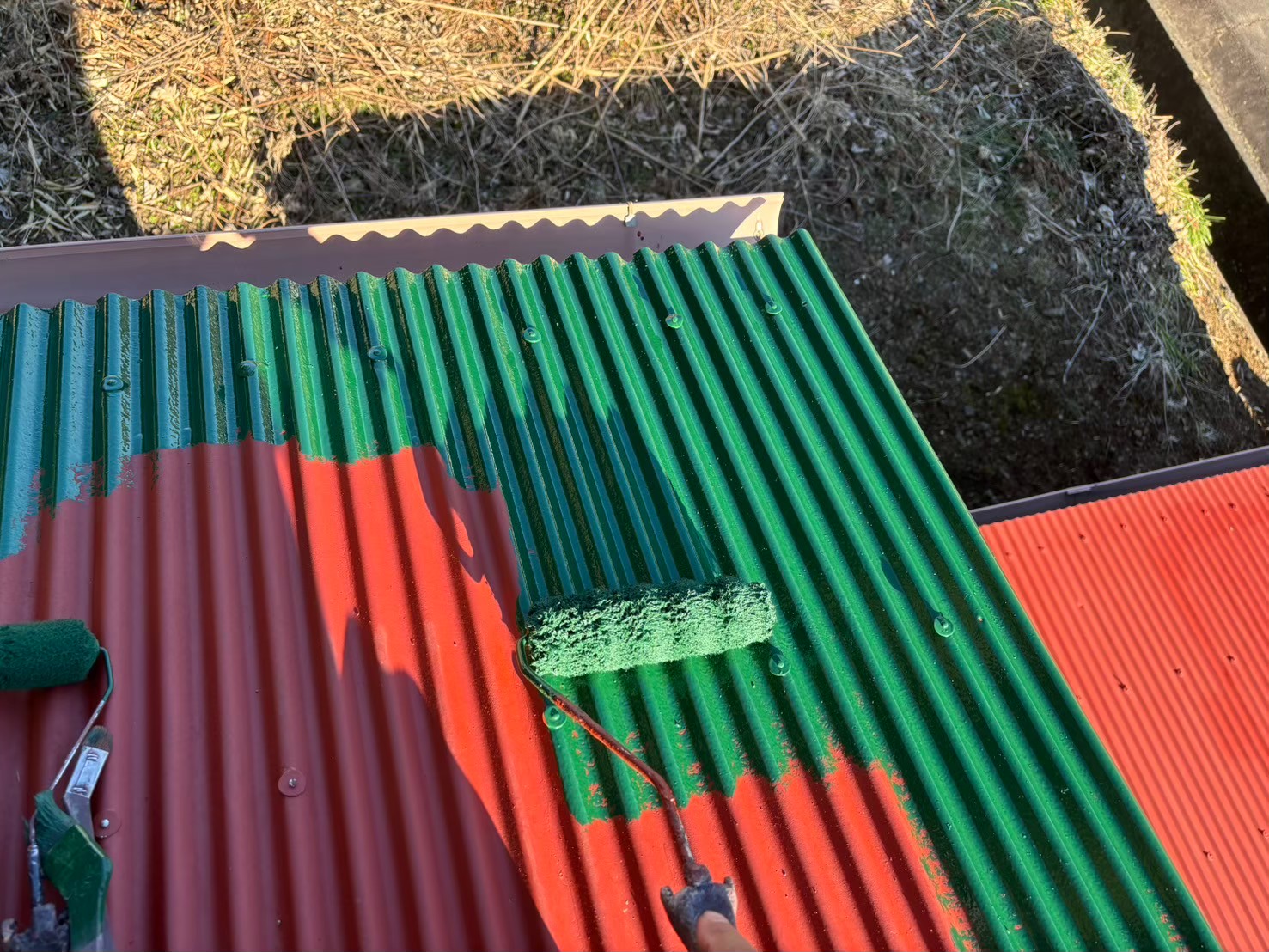 こちらの波型の屋根も錆止めを塗っていきます!